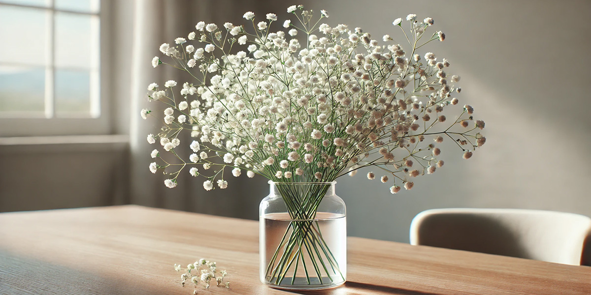 Для букета с гипсофилами понадобится высокая вытянутая ваза, которую следует тщательно промыть водой с использованием мягкой губки. Наполняется емкость больше, чем наполовину чистой отстоянной или отфильтрованной водой. Перед тем, как поставить букет в вазу, нужно сделать вот что: